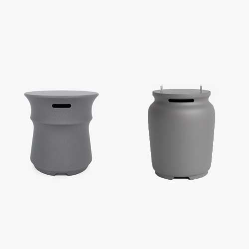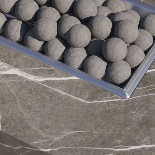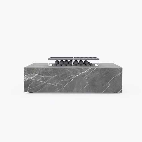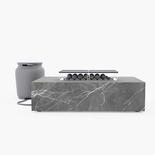 Innovative. Ceramic stone spheres add visual interest, act as a wind guard, keeping the flame centralized for maximum heat efficiency, and direct heat outwards to people seated around the fire pit.