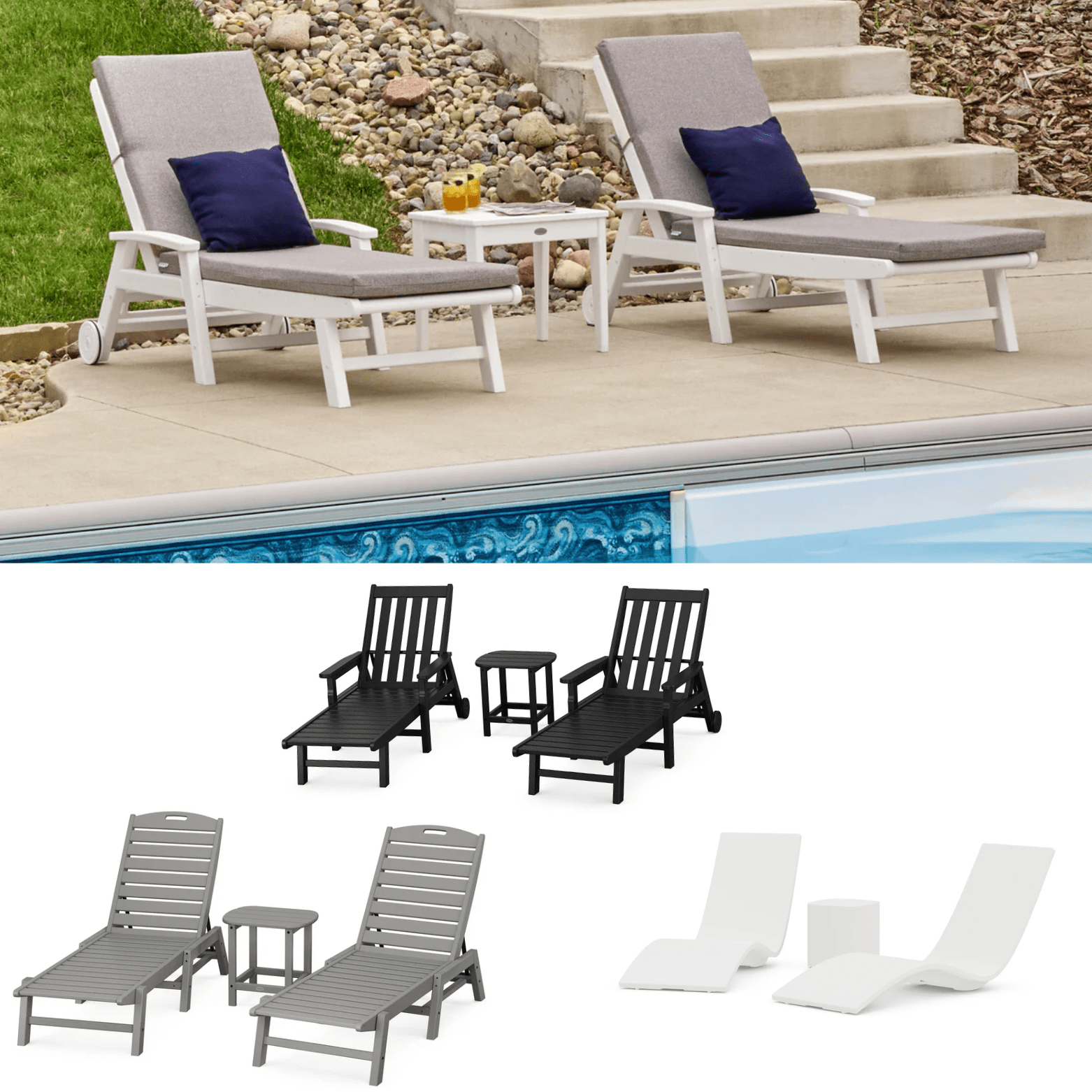 Reclining sling chaise with wheels. Made of durable recycled plastic with no maintenance sling fabric.